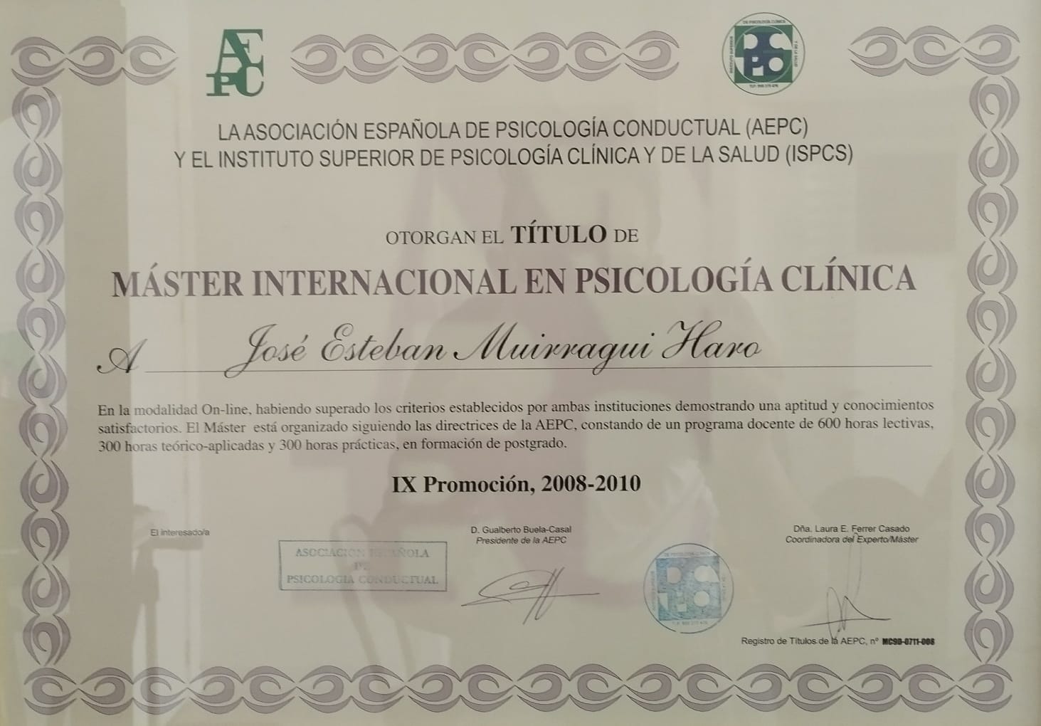 A continuación un resumen de las credenciales de Esteban Muirragui en Psicología Cognitiva Conductual: